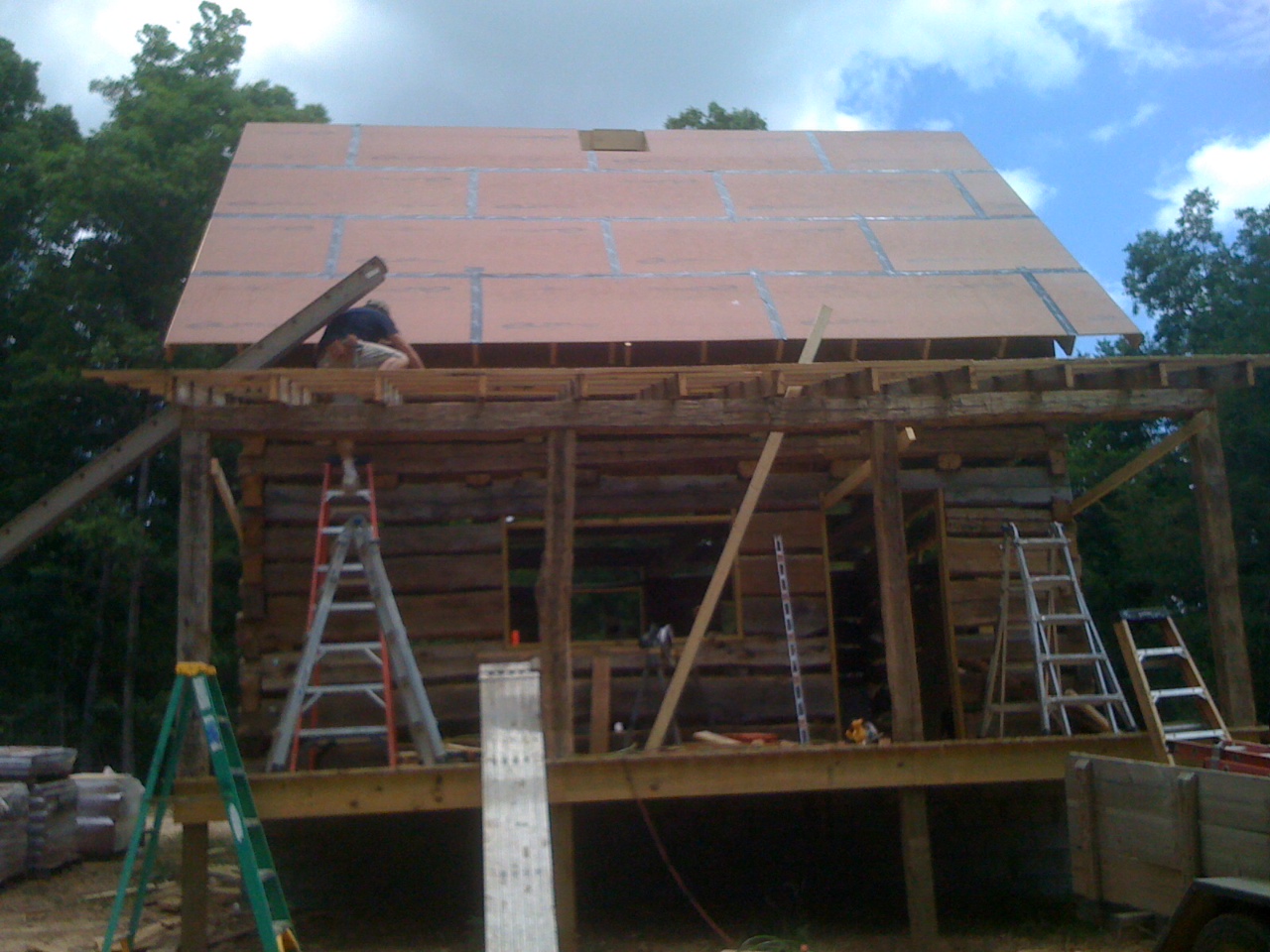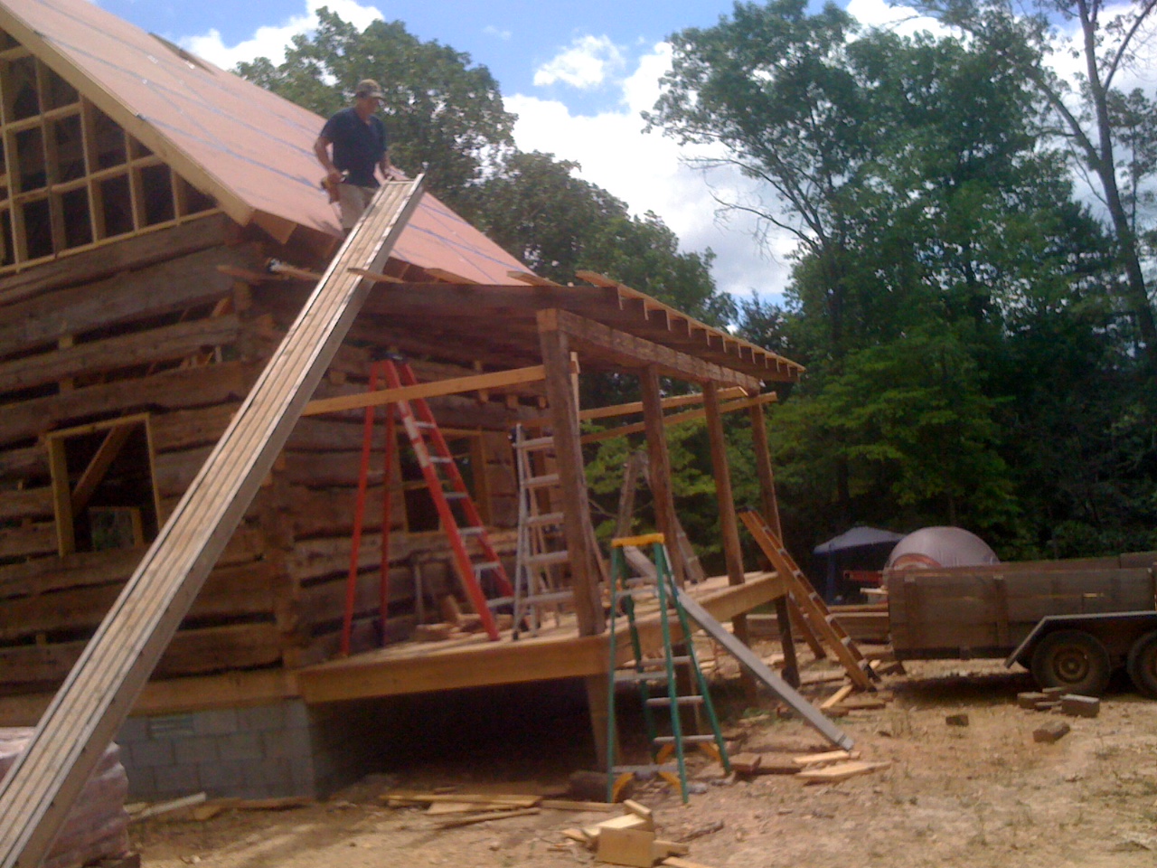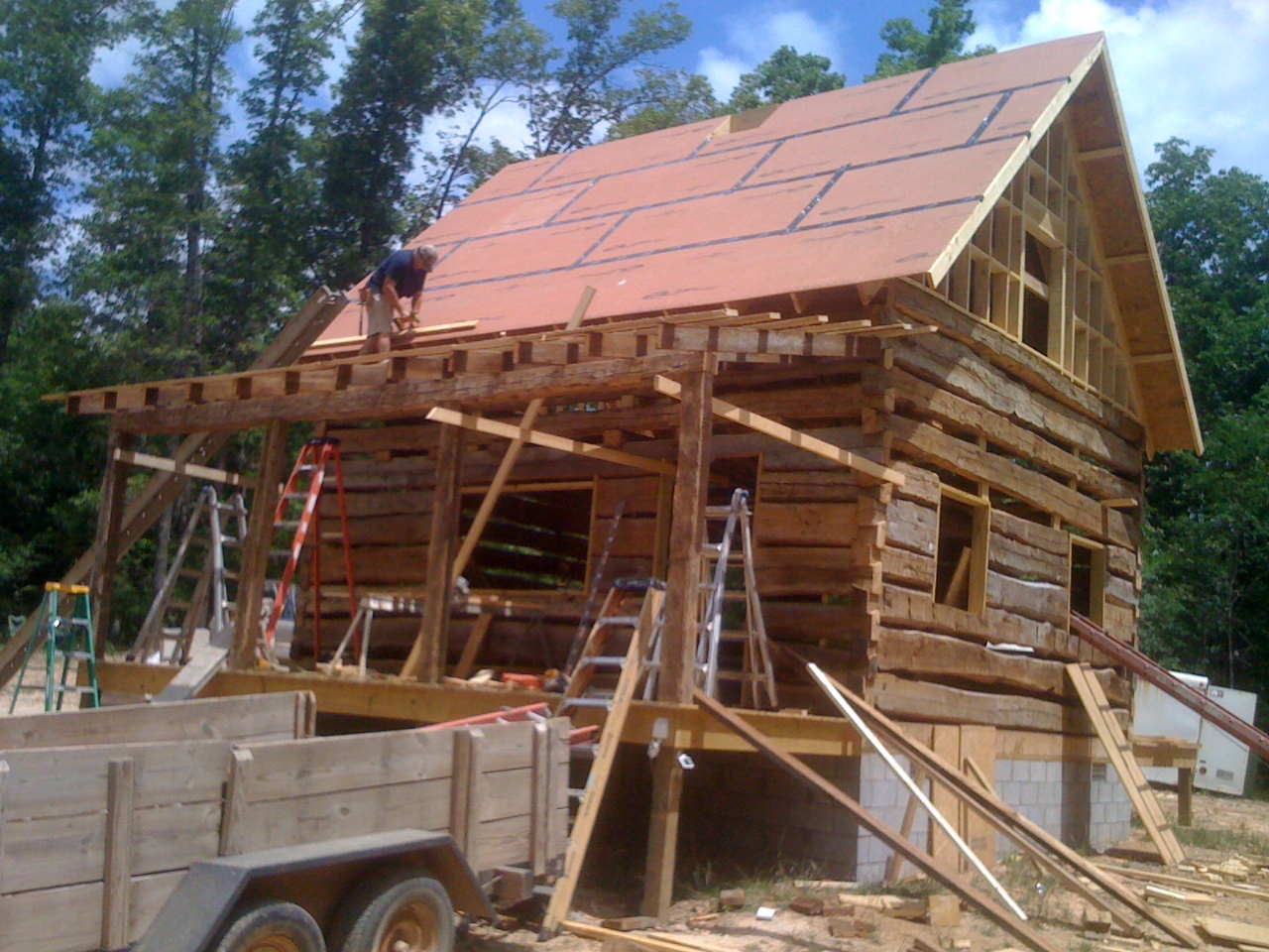 Progress is coming along nicely on the Antique Cabin as of 6/20/2012. Roof is decked, one of the 2 porches is ready for metal roof, we left off the rear porch for now so the mason can build the fireplace easier. We’re about to install the siding on the gables.