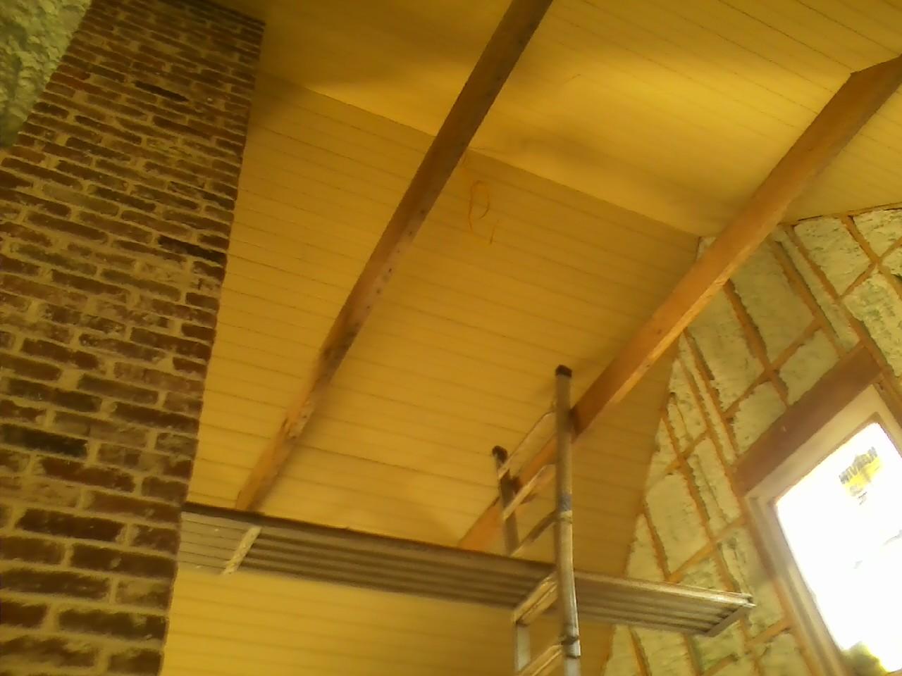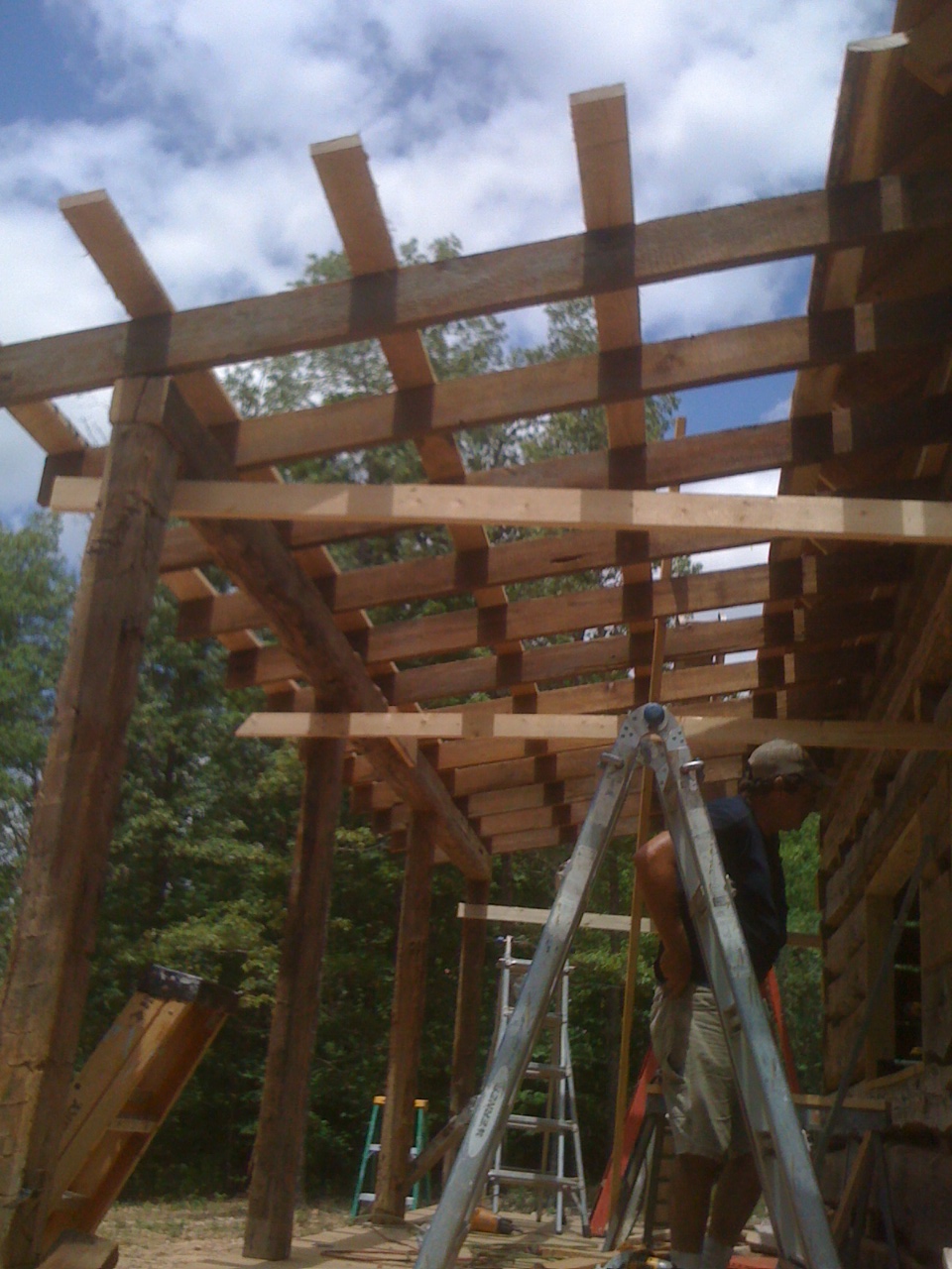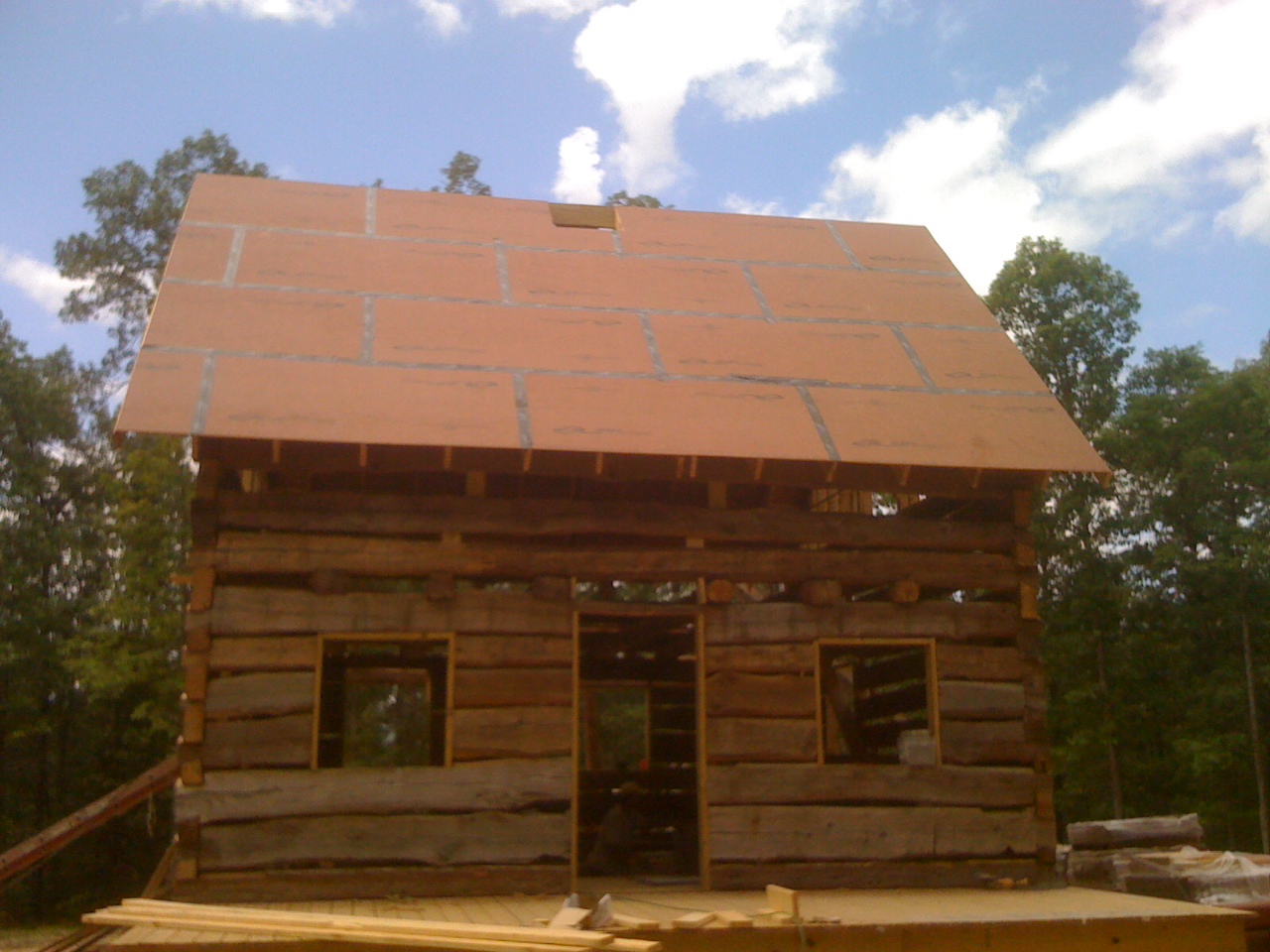 Progress is coming along nicely on the Antique Cabin as of 6/20/2012. Roof is decked, one of the 2 porches is ready for metal roof, we left off the rear porch for now so the mason can build the fireplace easier. We’re about to install the siding on the gables.