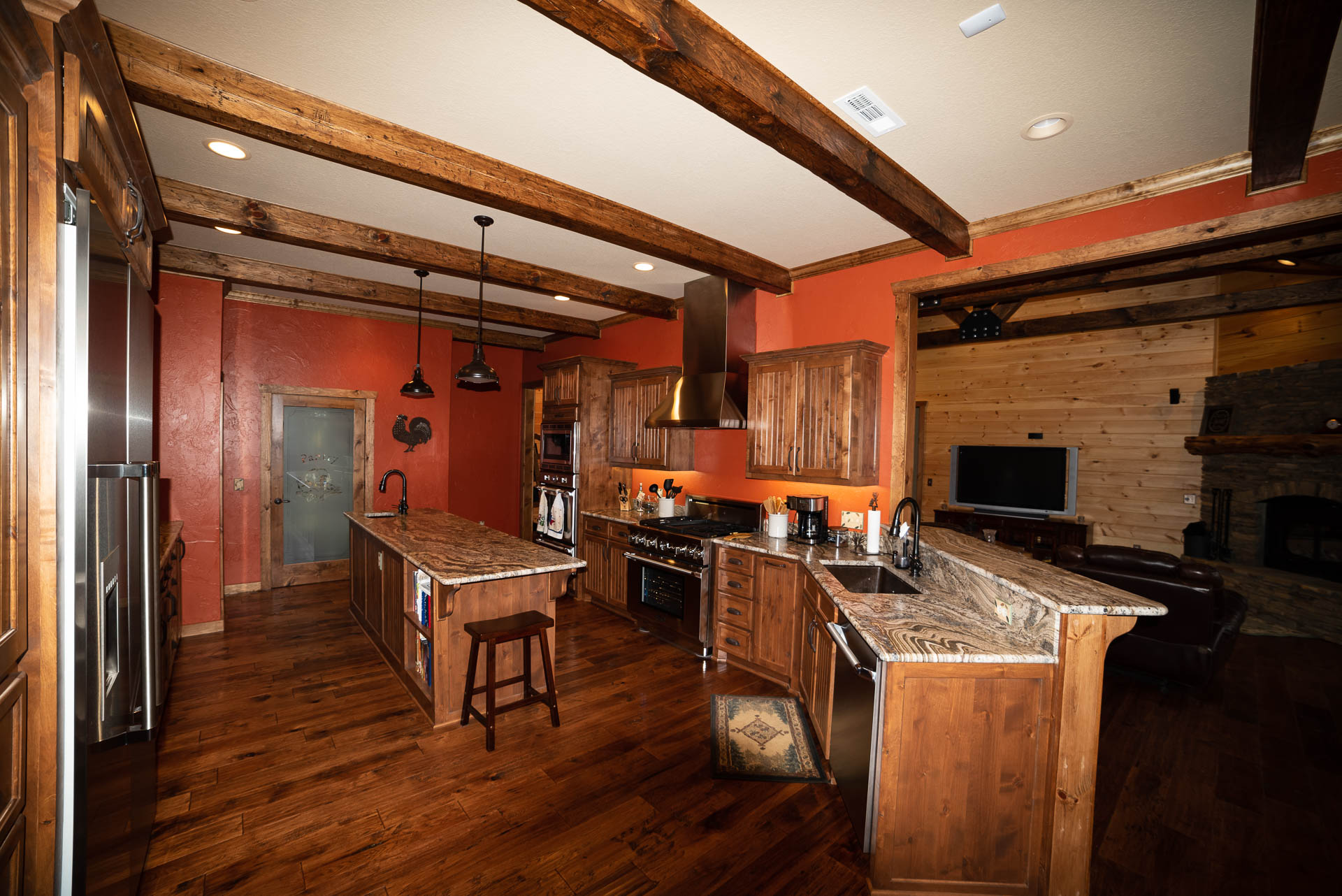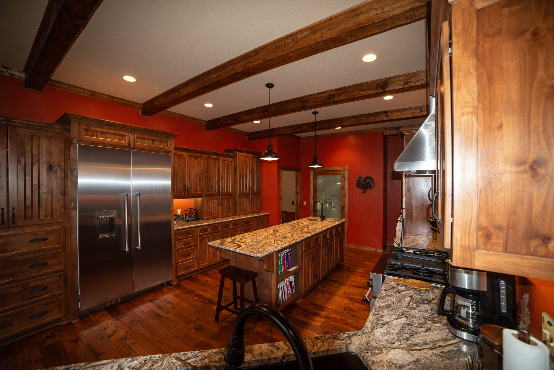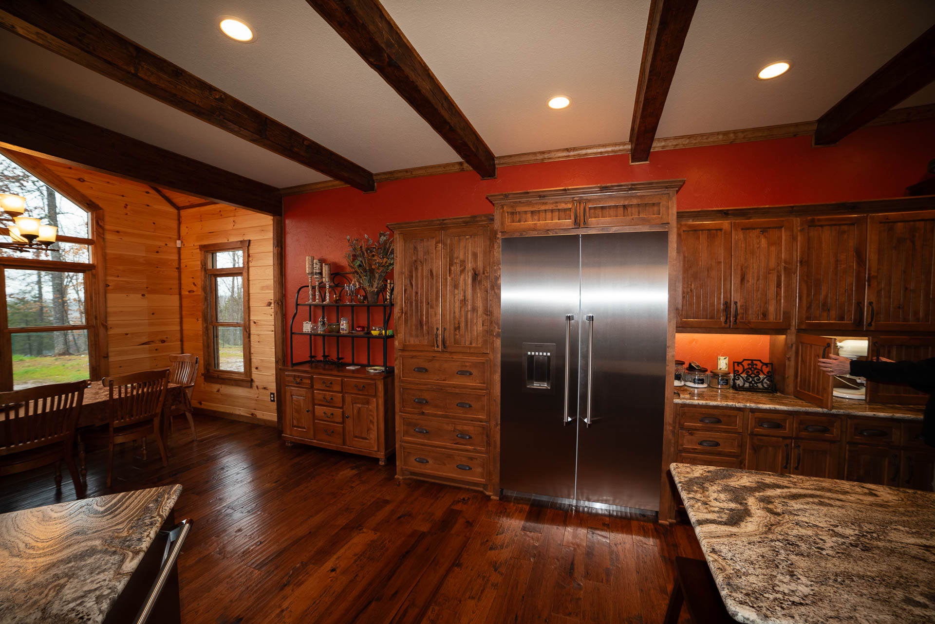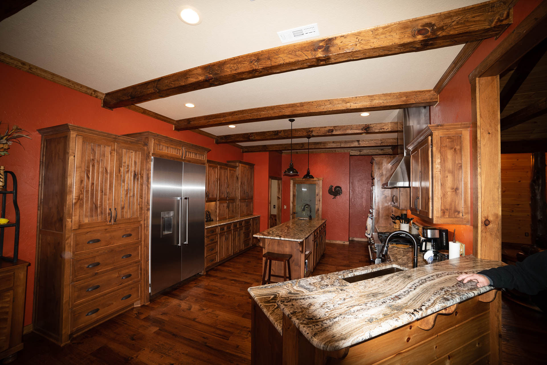 Incredible beamed trusses, cathedral ceilings, with mixed wood and painted interior and hand scraped hardwood floors and custom pantry and kitchen cabinets/countertops are just a few of the highlights in this beautiful custom home.
