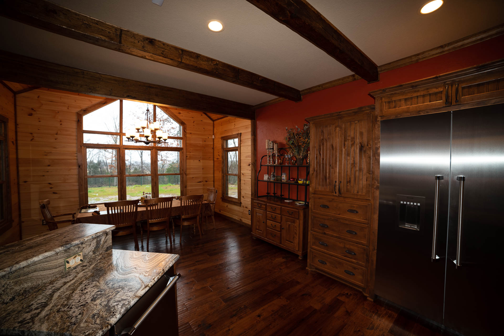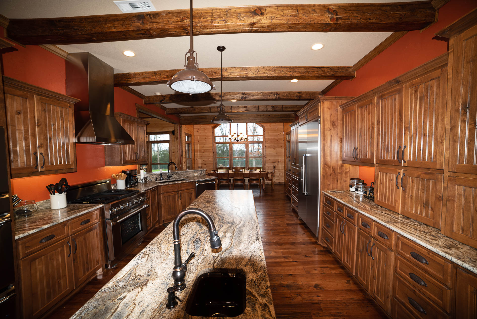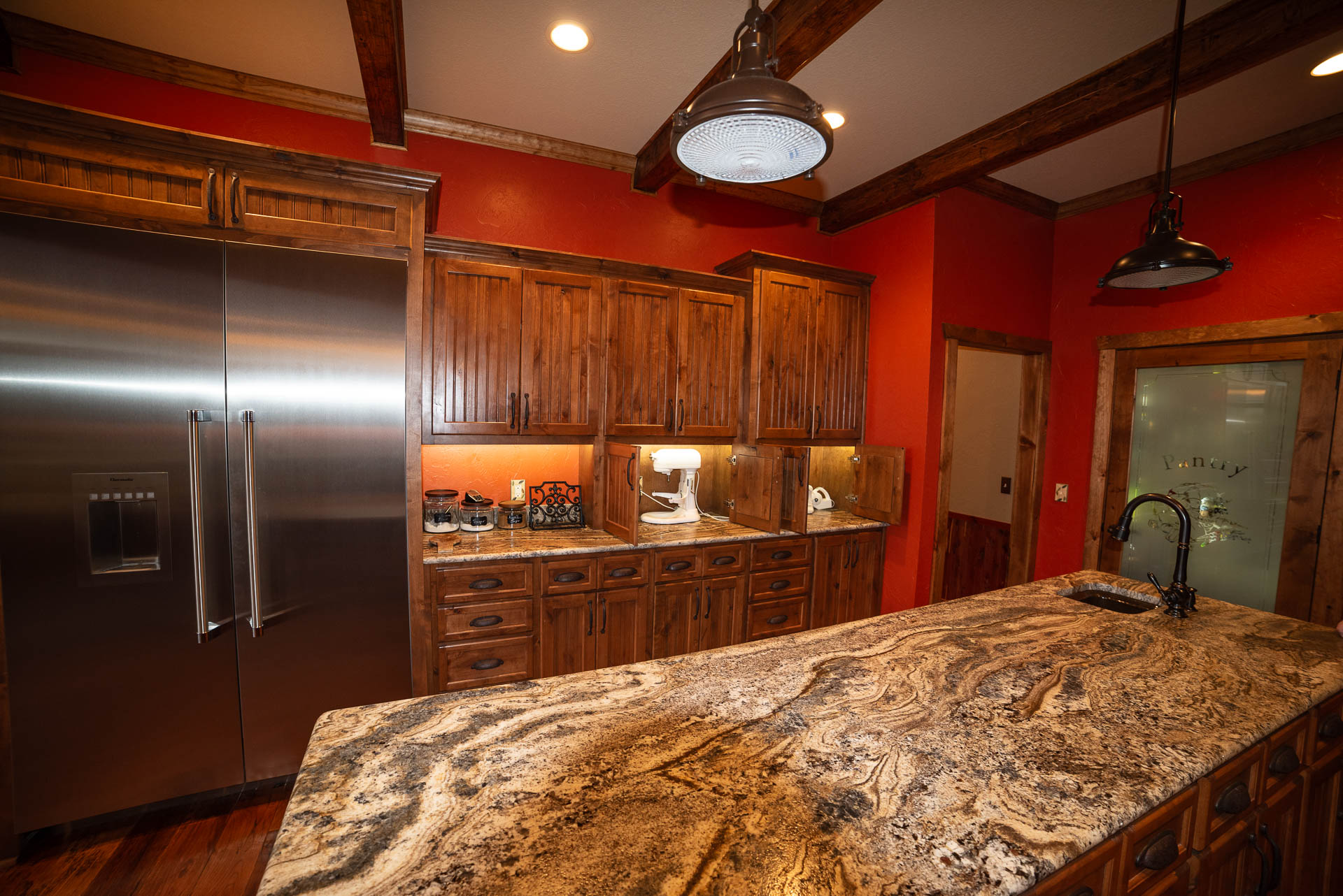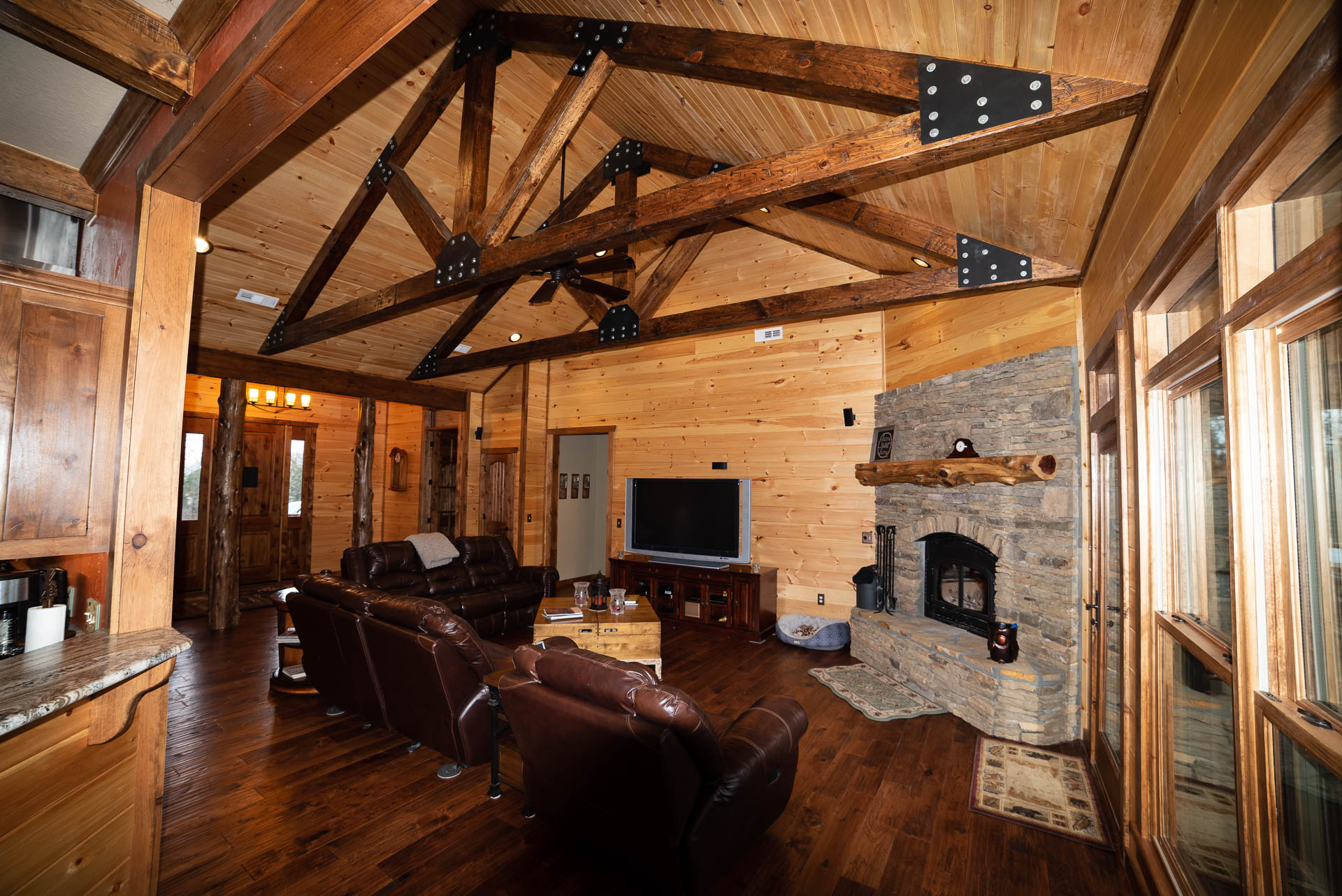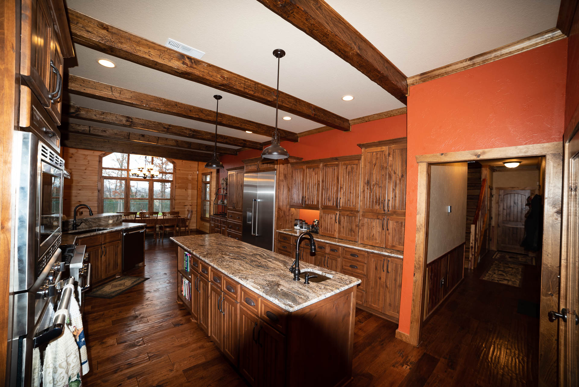 Incredible beamed trusses, cathedral ceilings, with mixed wood and painted interior and hand scraped hardwood floors and custom pantry and kitchen cabinets/countertops are just a few of the highlights in this beautiful custom home.