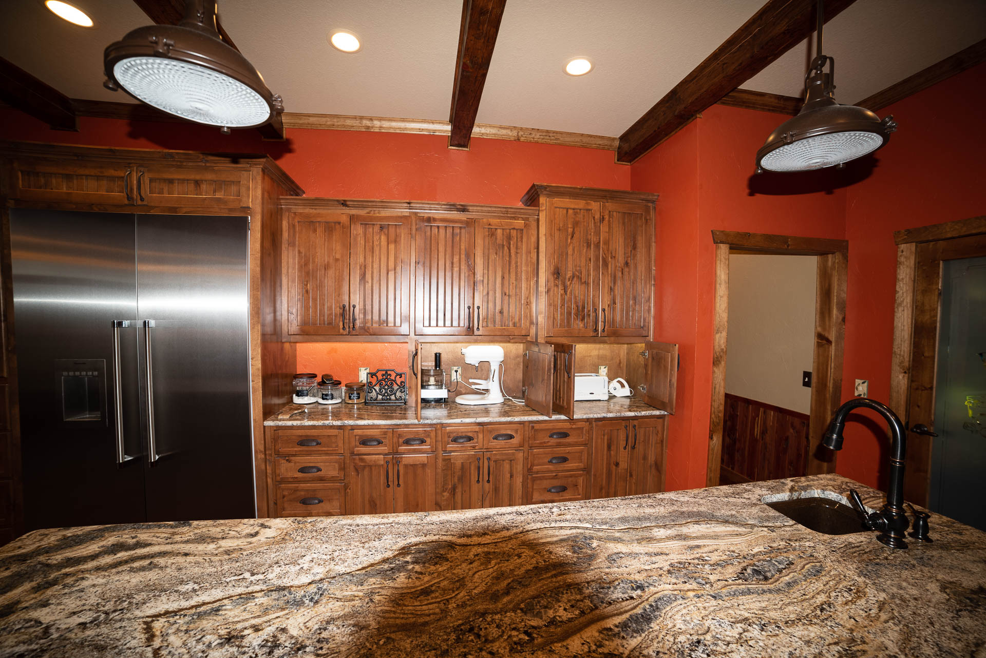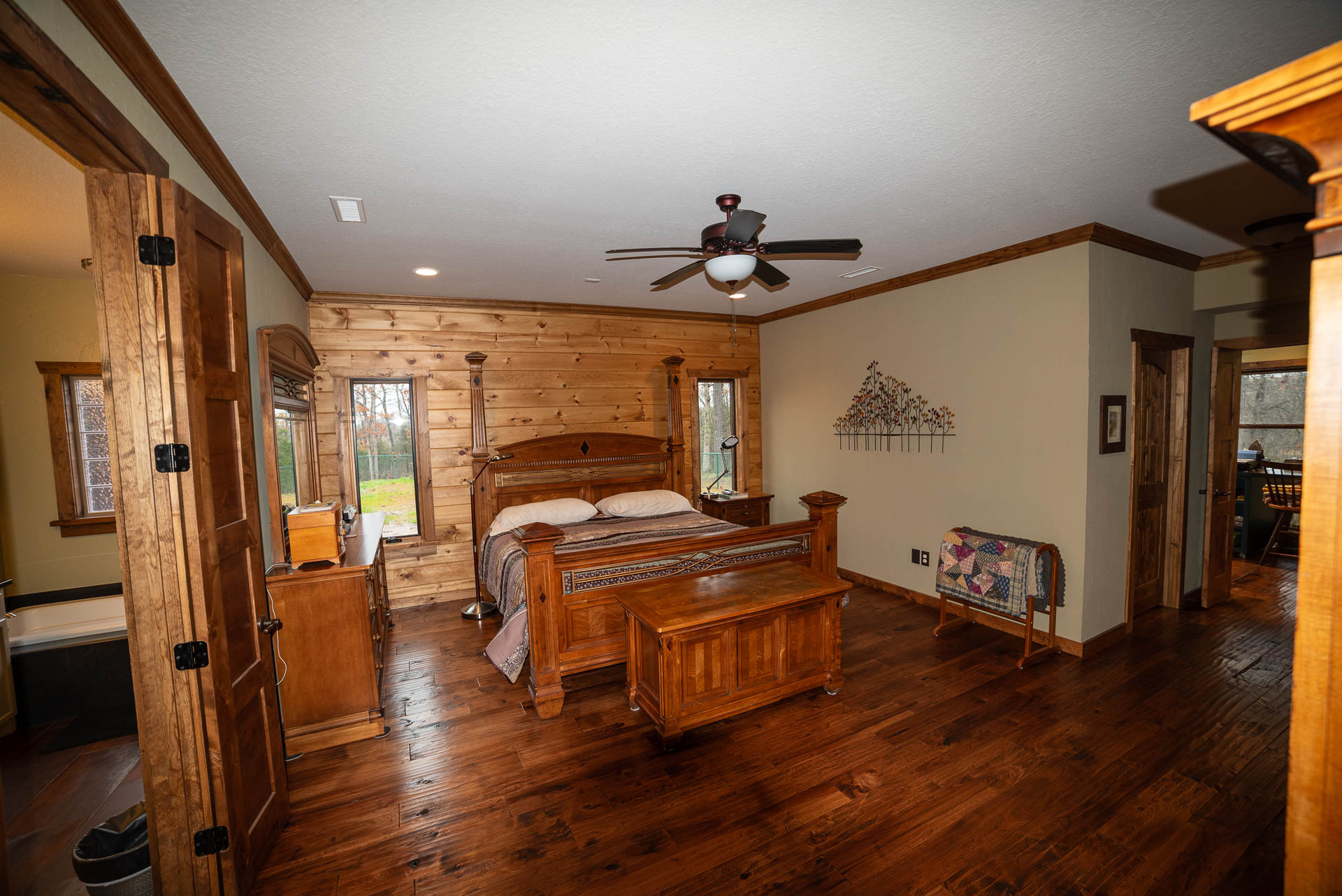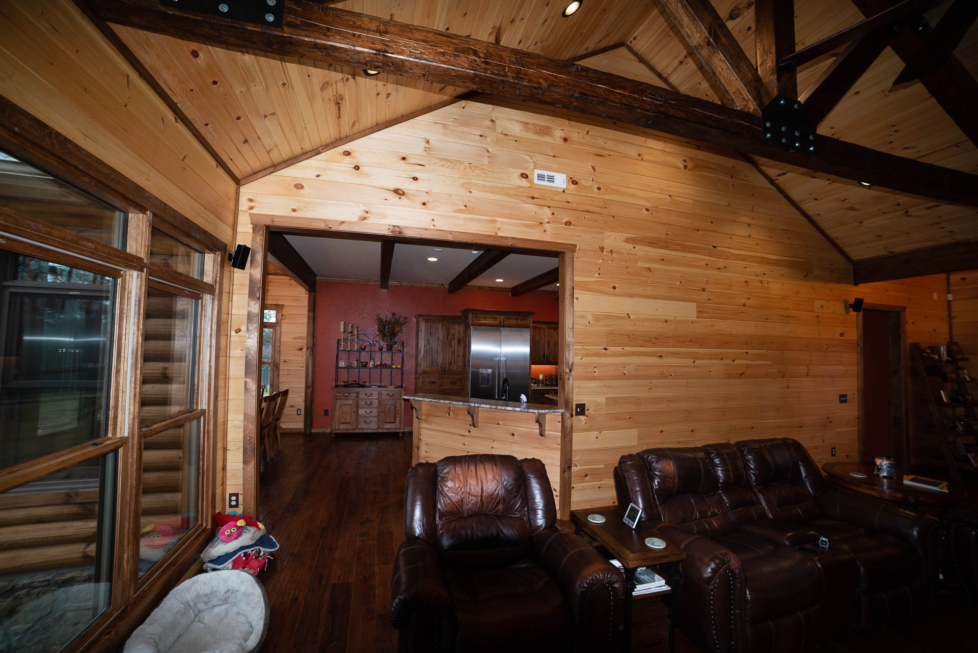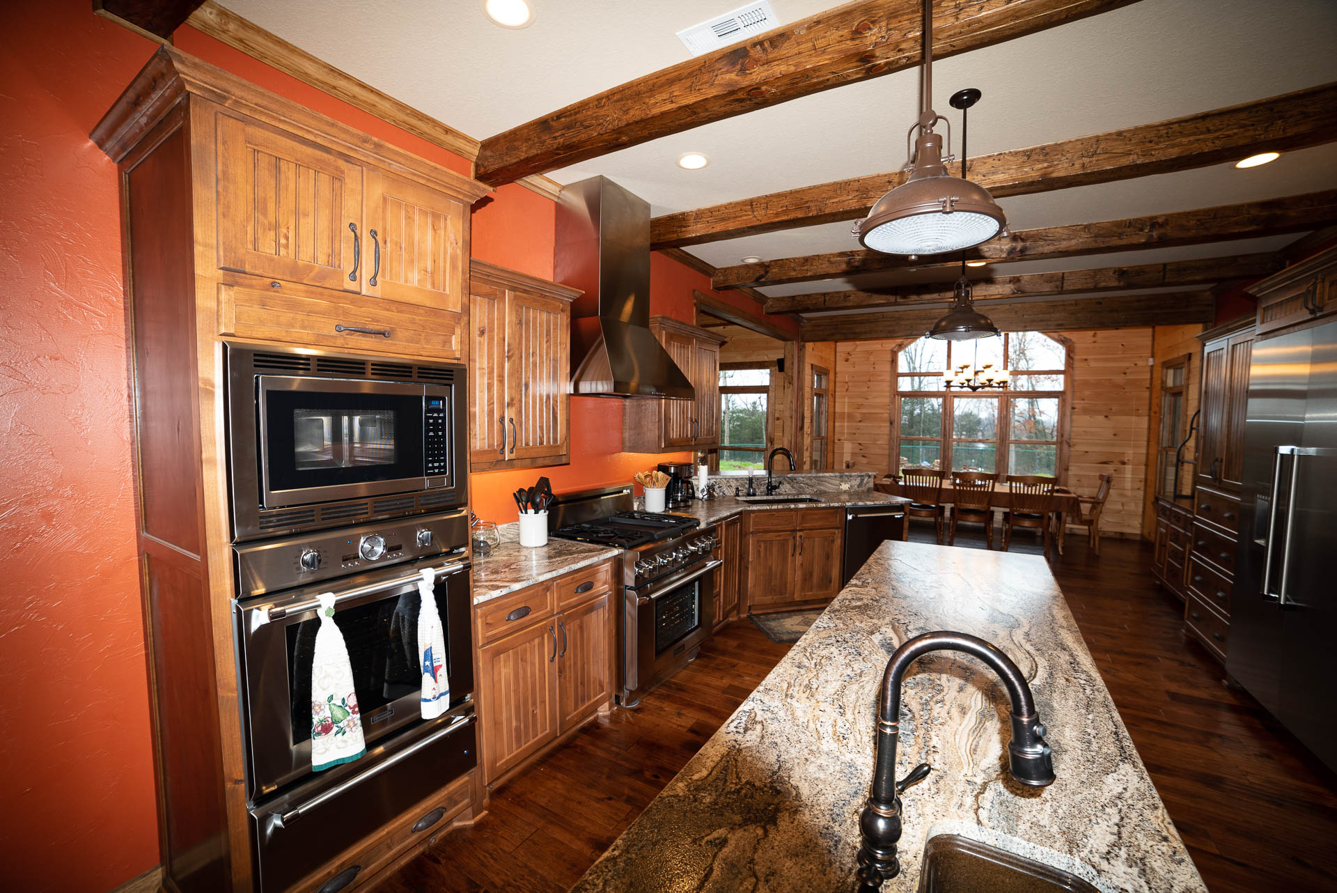 Incredible beamed trusses, cathedral ceilings, with mixed wood and painted interior and hand scraped hardwood floors and custom pantry and kitchen cabinets/countertops are just a few of the highlights in this beautiful custom home.